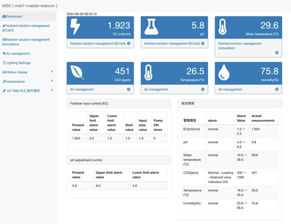 温湿度、EC、pH、栄養成分濃度(窒素・リン・カリ)等の計測及び調整制御